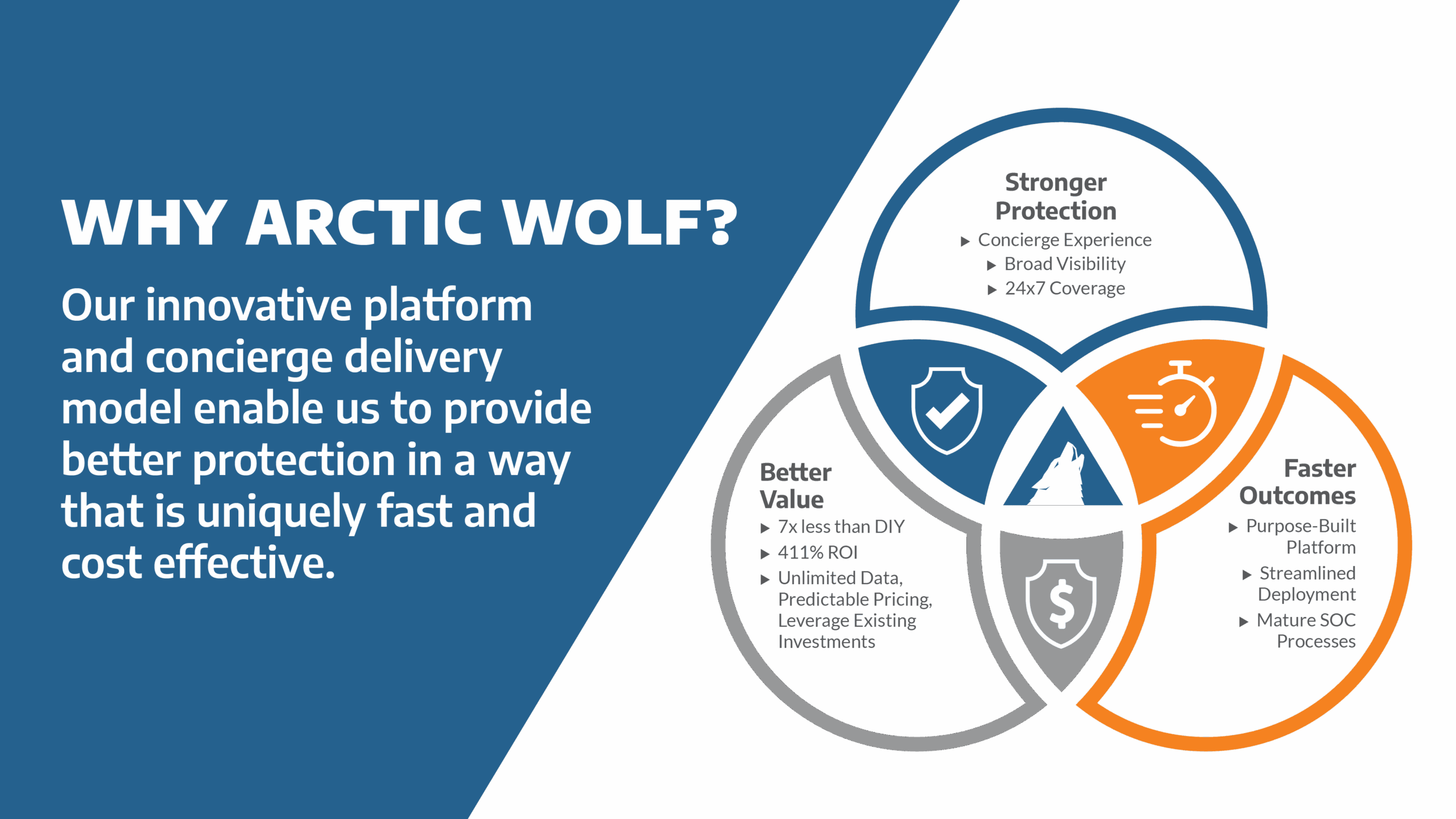 The Arctic Wolf Managed Detection and Response solution is anchored by a dedicated Concierge Security Team who monitors your network 24×7, handles log aggregation and correlation, actively hunts for threats, and provides custom alerts and reports when cyberattacks occur.