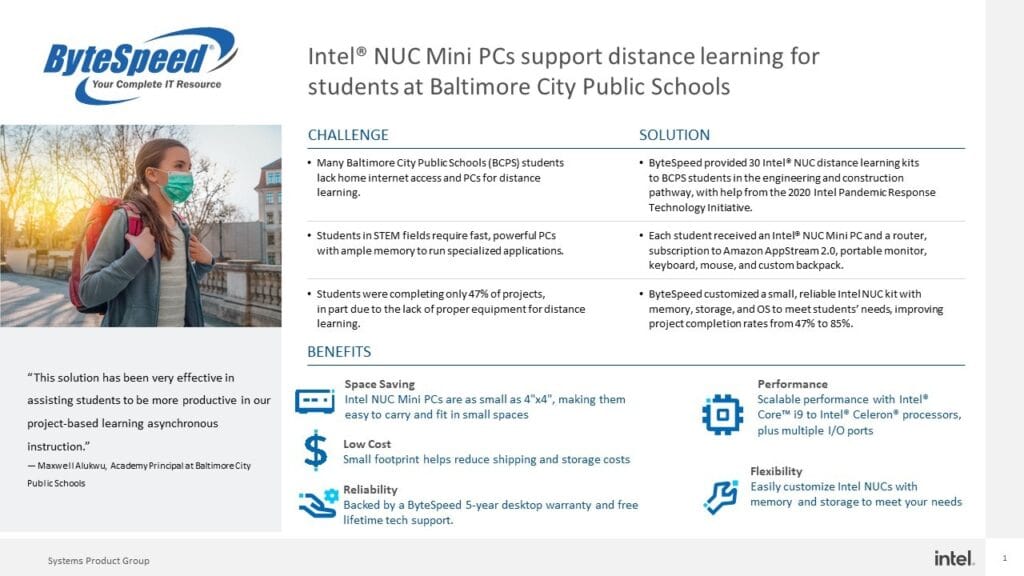 Many Baltimore City Public Schools (BCPS) students lack home internet access and PCs for distance learning. ByteSpeed provided 30 distance learning kits to BCPS students, with help from the 2020 Intel Pandemic Response Technology Initiative.