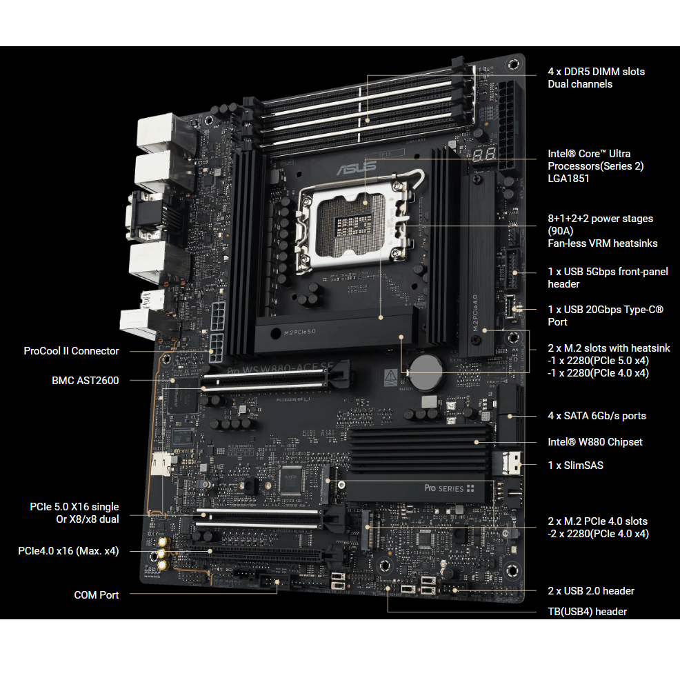 The ByteSpeed Workstation W880A empowers workstation users of all levels by maximizing the performance of the latest Intel Core Ultra Processor (Series 2) processors with 8+1+2+2 team power stages, DDR5 slots, PCIe 5.0 and lightning-fast connectivity including Thunderbolt 4 port, dual 2.5Gb Ethernet. The workstation motherboard is engineered to support dual graphics cards, making it an ideal choice for content creation, AI and deep learning, and IT management.